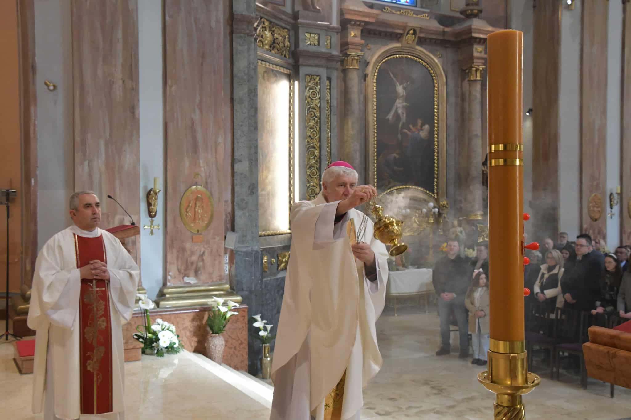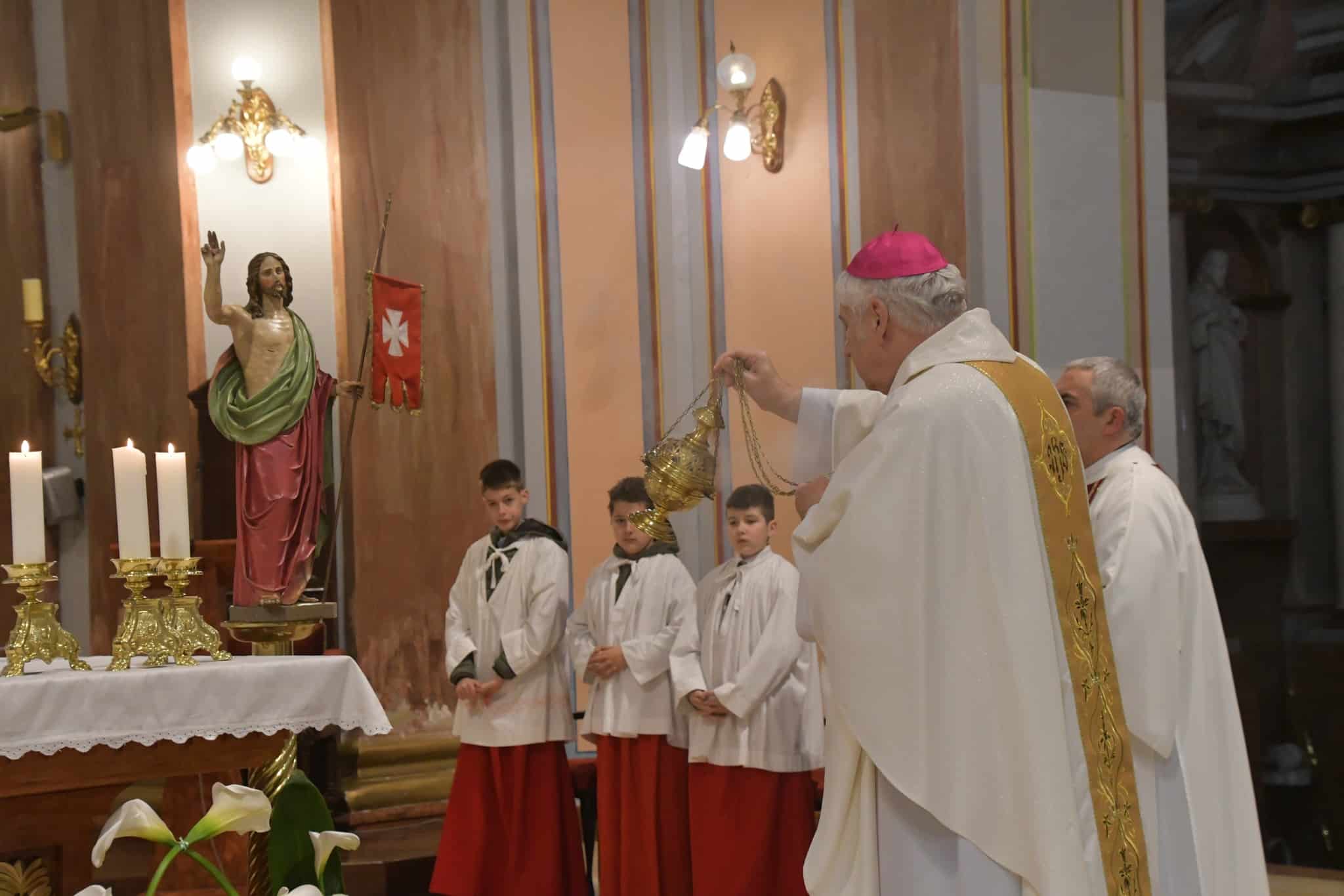 Biskup je u prigodnoj homiliji podjetio kako je sinoć u vazmenom Hvalospjevu naša Crkva otpjevala svoju vjeru i svoju uskrsnu radost. A i danas želi sve nas potaknuti na istinsko veselje koje proizilazi iz srca i duše. »Ovo je dan što ga učini Gospodin: kličimo i radujmo se u Njemu«.