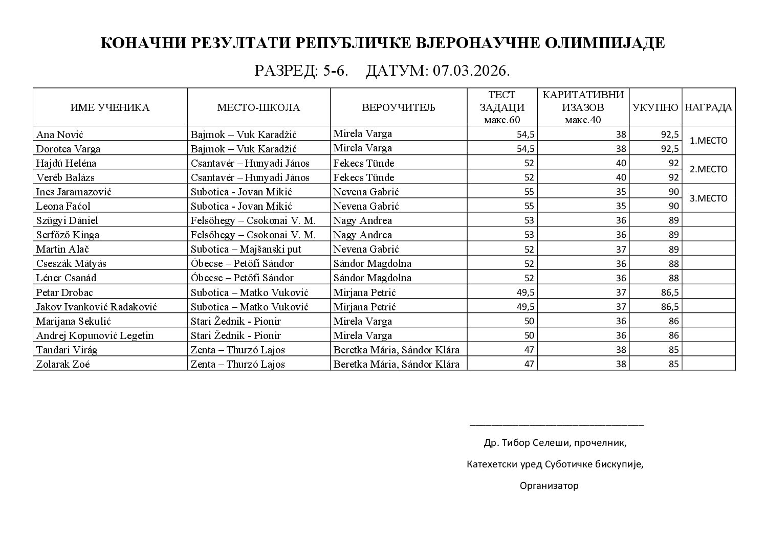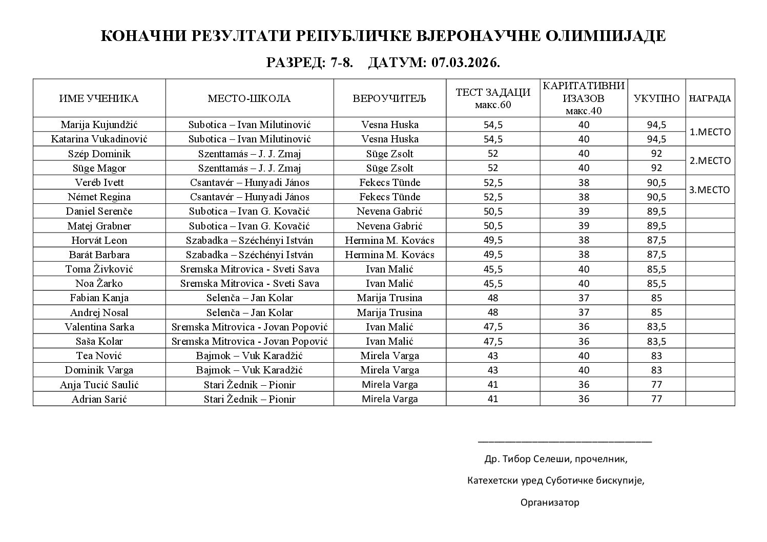 U subotu, 7. ožujka, kolegij Emmaus u Mužlji bio je domaćin Republičkog finala katoličkog vjeronaučnog natjecanja, koje je po prvi put akreditiralo Ministarstvo prosvjete. Na natjecanju je sudjelovalo 38 učenika iz cijele Srbije, koje je pripremalo 12 vjeroučitelja. Natjecatelji nisu samo pokazali svoje teorijsko znanje rješavanjem testa, već su predstavili i primjere karitativnih projekata koje su proveli u svojim župama ili školama. Radovi prezentirani pred stručnim povjerenstvom vjerno su prikazali glavnu poruku natjecanja: vjera nije samo znanje, već i sprovođenje Isusova nauka u djelo. Za sudionike i njihove mentore ovaj je događaj potvrdio snagu zajedništva i radost učenja vjeronauka. Posebna zahvala pripada vjeroučiteljima na višemjesečnom, požrtvovanom radu uz pomoć kojega je vidljiv napredak učenika.